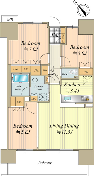 3LDK LD 11.5帖 1室/K 3.4帖 1室/洋室 5.6帖 1室/洋室 7.0帖 1室/洋室 5.0帖 1室 |