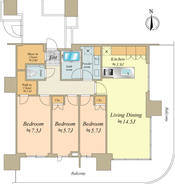 3LDK 洋室 7.5帖/洋室 5.7帖/洋室 5.7帖/LDK 18.4帖 ウォークインクローゼット・シューズインクローゼット有 |