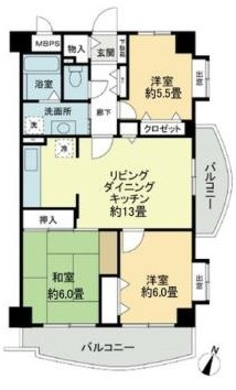 3LDK LDK 13.0帖/和室 6.0帖/洋室 6.0帖/洋室 5.5帖 |
