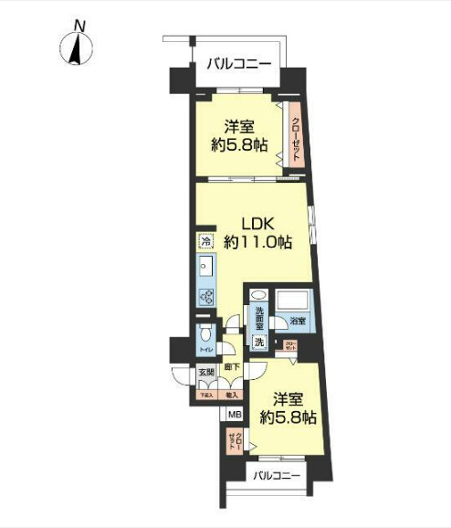 2LDK LDK 11.0帖/洋室 5.8帖/洋室 5.8帖 |
